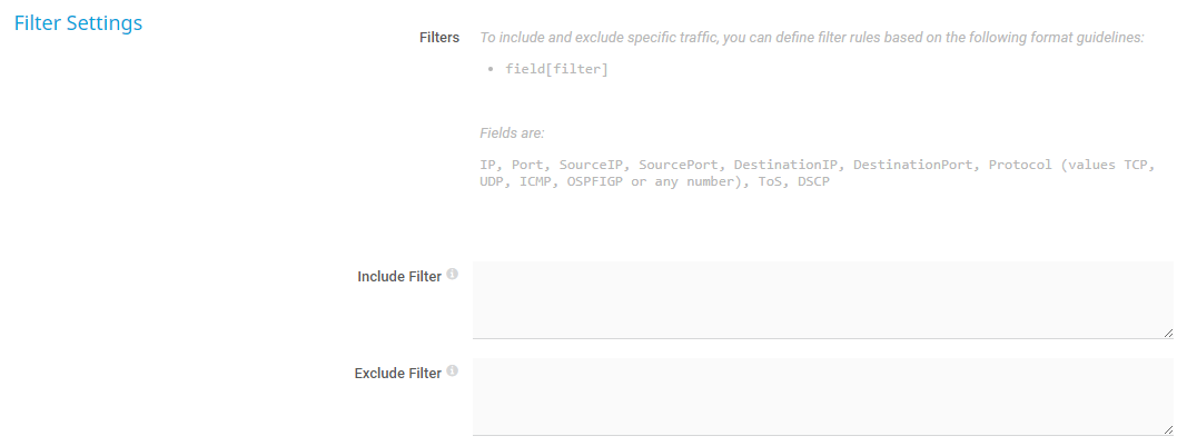 Define if you want to filter any traffic. If you leave this field empty, the sensor includes all traffic. To include specific traffic only, define filters using a special syntax.